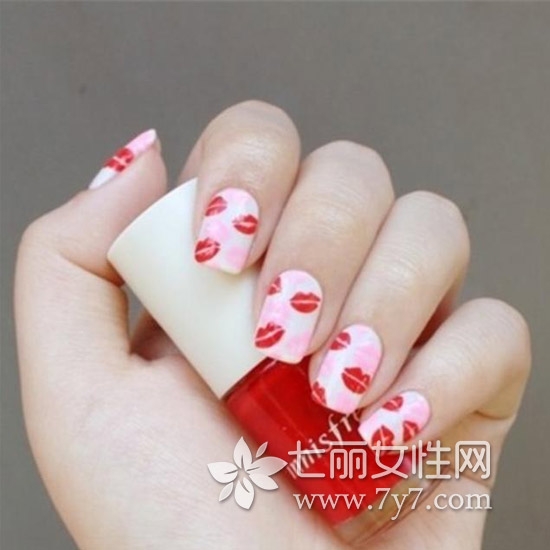 红唇元素本身就是时尚的代表,就算单独的在一件衣服上印满红唇图案,也会看着时尚,红色和白色的搭配更显得简洁、明了。这里的红唇美甲,还搭配了粉唇来衬托,比单独的红唇元素更加层次丰富了。而且浅粉的搭配,也不会显得花哨,依旧是很简洁的画面,画在指甲上面,除了时尚,还有一种小女生的味道,很甜美,这款美甲不单单是性感,更多了一点甜美温馨的感觉。
