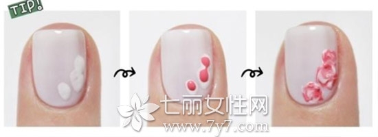 STEP2:其中困难最大的就数玫瑰花了,在已经干透的白色甲油右下侧点上几滴白色,再点上略小一些的粉色,之后用美甲笔略加搅动混合就可以。