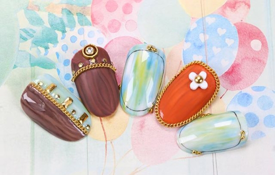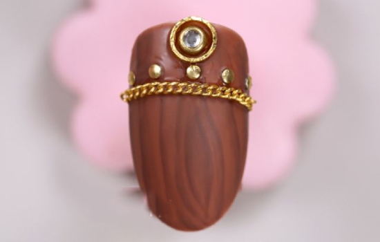第六步:用小笔沾取光疗胶涂抹在甲面上,然后把金链、铆钉、金环和钻都粘上去,稍微调整下位置,照灯。最后刷上一层磨砂封层,这样一款木纹美甲就完成啦~