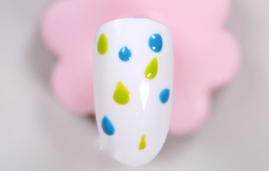 第一步:完成白色打底。先用蓝绿色甲油胶点几点,再用青色甲油胶点几点,还有白色哦~