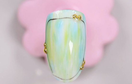 第三步:用小笔沾取黑色彩绘胶,在甲面内部画一圈,照灯。把钢珠用光疗胶粘上,照灯。刷上一层封层,木纹美甲中最重要的木纹图案的甲面就完成啦~