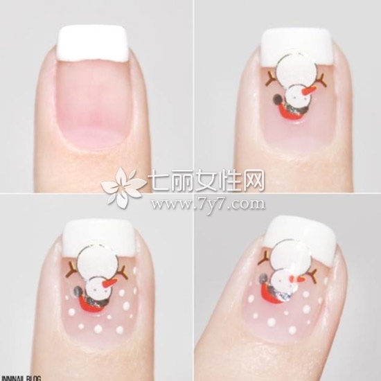 STEP2:不能少的自然还有雪人,把贴纸贴好后,再用美甲笔点上一些小圆点,让白雪飞起来~
