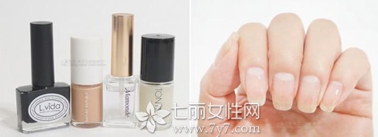 STEP1:准备好黑色和肉色甲油,重要的磨砂顶油,然后先涂抹上透明的底油吹干。