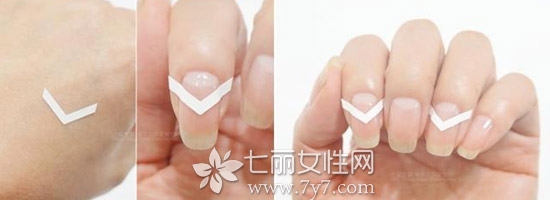 STEP2:用V型美甲贴挑选两个指甲贴在如右图的靠后部位。