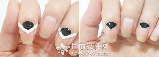 STEP3:在指甲末端涂上黑色甲油,然后揭去指甲贴,就呈现了扇形的黑色。