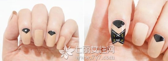 STEP4:再其他空余指甲上都涂上肉色甲油,干透后再在一个有黑色甲油的指甲上如右图般形状的黑色。