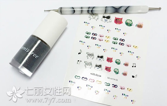 所有用到的工具就是这么简单。一瓶深灰色的指甲油,一张猫头鹰图案的贴纸。当然也可以用别的贴纸玩。主要是学会下面的步骤。