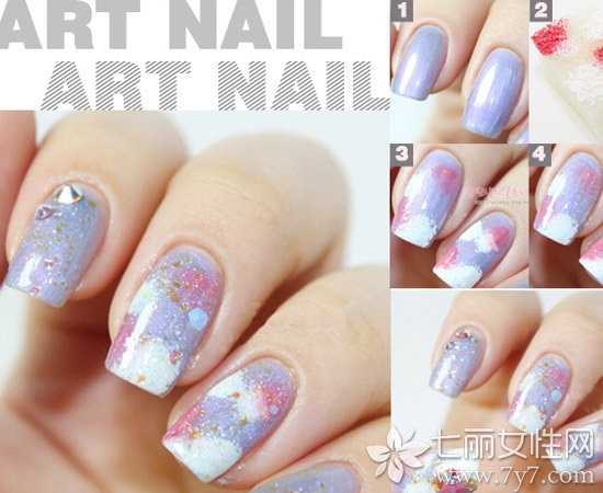 Step3:拿起附上指甲油的海绵,轻摁海绵让颜色覆盖在涂好底色的指甲上;