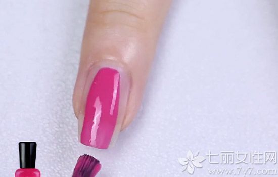 涂完之后,等涂好的指甲油彻底干掉,一定是这样的,很多人涂出来不好看,也是因为涂好的指甲油没有干掉,就进行了这一步。干后,再涂上薄薄的一层指甲油。再上第二层加强颜色。