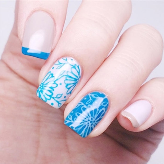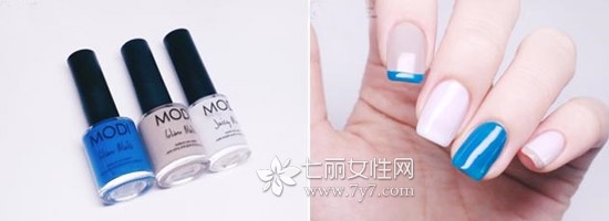 STEP1:准备蓝色、裸色、白色甲油,各自挑选指甲当做底色涂抹,按照右图的样子,画满五个指甲底色。