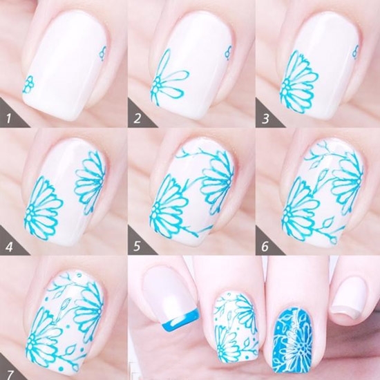 STEP2:高手,请看过来,到你们发挥的时候了!在白/蓝底色上用相反的颜色像图中的步骤那样画出花蕊到花朵到枝干。