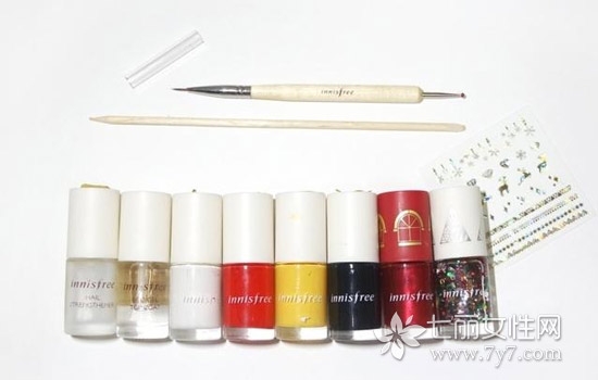 需要准备大红、黄、黑、珠光红、彩色亮片款这些甲油,还有美甲画笔。