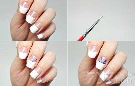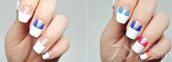STEP1:等透明底油干透后,用白色涂抹一半指甲,然后向下排图片中所示,从分界线中间画出蓝色V型,并用同色勾边。