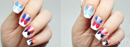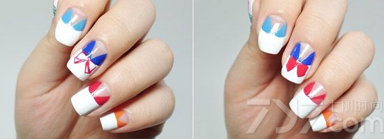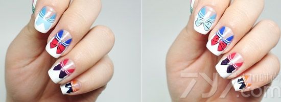 STEP4:再用不同色在其他指甲上也画好蝴蝶结,之后用白色在最早画的两侧三角区勾勒2条细细的线条。