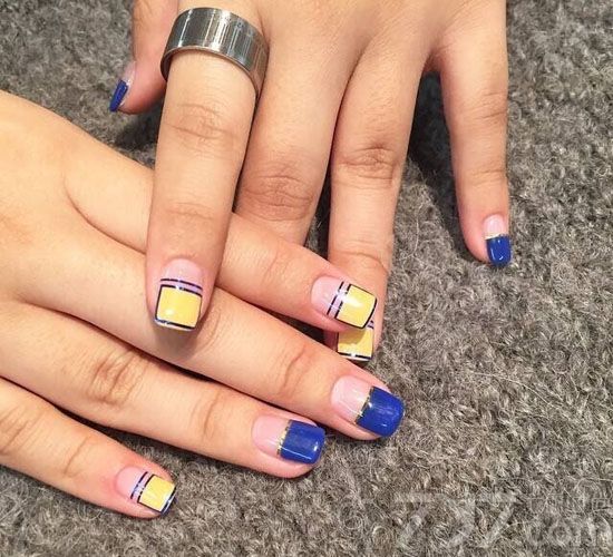 色彩撞色不仅仅只是服饰上的福利,美甲上撞色更时尚哦!深海蓝色边框,粉黄色甲油为底,整款美甲设计感非常强,适合想要与时尚接轨的女性。