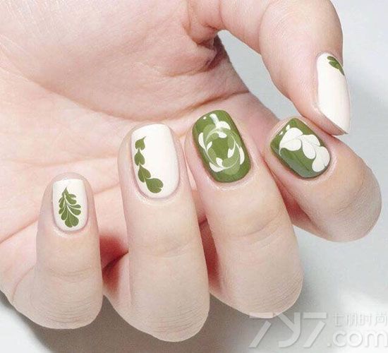 这款美甲比较简单,自己在家也可以做的美甲。色调清新,深绿色甲油勾勒出树叶的模样,深绿色甲油对眼睛也比较好哦!