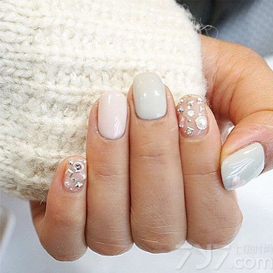 说道简洁美甲必少不了米色系,米色甲油作为单色美甲,大块亮片贴在透明甲油为底的指甲上,简洁大方,适合穿着白色宽松毛衣哦~