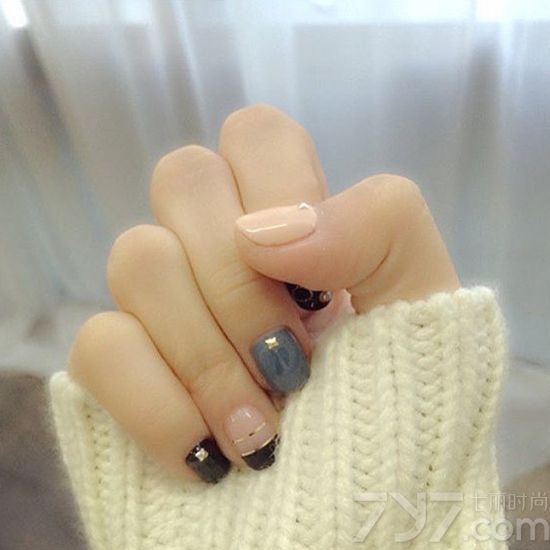 简洁美甲不一定要是浅色系,深色系的美甲一样很简洁哦!这款美甲也是采用黑色甲油与金属边搭配,加上灰色甲油,真的猴赛雷哦~