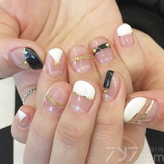 黑白如此百搭的颜色,配上金属风的贴纸,让这款美甲多了一点机车风,但很简洁,金色素材很多,但不会给人一种非常浓重的感觉。