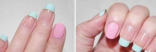步骤2:将食指涂抹上草莓粉指甲油,剩余的其他手指的尖端涂抹上薄荷绿指甲油。
