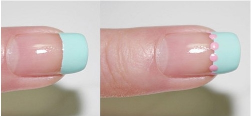步骤3:在涂抹了薄荷绿指甲油的指甲边缘点上4个粉色小圆点。
