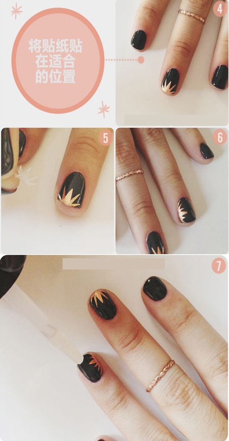 步骤4在指甲油半干状态下,将准备好的剪纸贴在指甲上合适的位置。