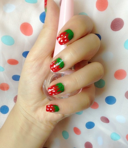 完成效果图:这款草莓色美甲教程,整个步骤在看到颜色上相信很多MM都会爱上,因为清新的绿色加上鲜艳的红色,就能看出非常的简单,加上小工具的辅助更能快速完成。