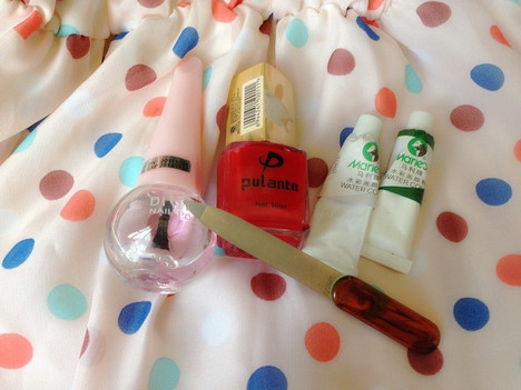 Step1:首先准备好一拼护甲油,加上一个白色颜料盒以及绿色颜料,还有笔,透明护甲油,做好一切准备工作,再涂抹上一层护甲油。