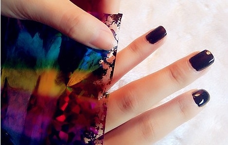 Step3:在指甲油快干时将原宿指甲贴粘上去,再迅速撕下来,这样上面的图案就会留在指甲上。