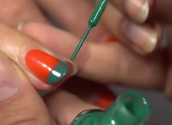 拼接式的服装,拼接式的美甲在近年来都非常的流行,一款以橙、绿、蓝三种颜色组成的方块图案极具时尚感,成为2014最个性美甲图片,下面就来看简单方块美甲教程!
