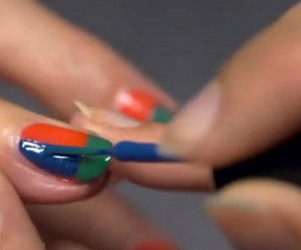 拼接式的服装,拼接式的美甲在近年来都非常的流行,一款以橙、绿、蓝三种颜色组成的方块图案极具时尚感,成为2014最个性美甲图片,下面就来看简单方块美甲教程!