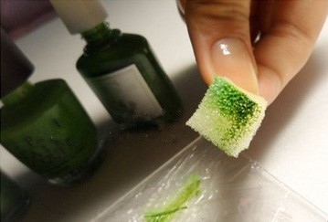STEP 2:将事先准备好的小海绵蘸取保鲜膜上指甲油。