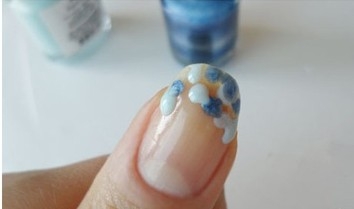 STEP2:如图所示,在指甲前端随意点上几点两种不同蓝色的指甲油。