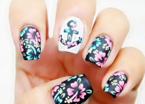 这款美甲是不是很有春暖花开的气息呢,黑色指甲油做底色,画上红花绿叶,很大气的一款花朵图案。春季出街无论搭配什么衣服都很有范。