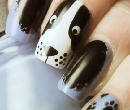 如果你是爱狗一族,那就画上呆萌的小狗狗美甲,中指是狗狗的脸,食指和无名指是狗狗的耳朵,尾指则是小脚印,很可爱又个性的美甲