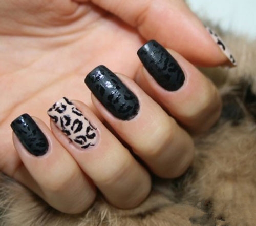 黑色亚光的指甲油作为底色,大拇指和无名指用裸色作为底色,然后画上豹纹的图案,让你散发出女人味,低调又时尚,在家就能轻松搞定。