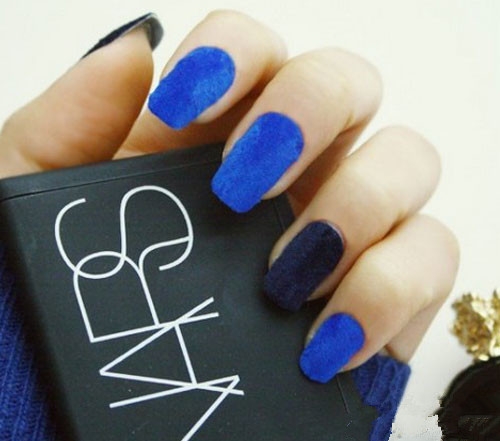 蓝色的丝绒美甲,宝蓝色与深蓝色的搭配更加有范,无名指使用深蓝色的丝绒显得更加特别,不会单调,很有大牌的Feel,丝绒的美甲尤为别致。