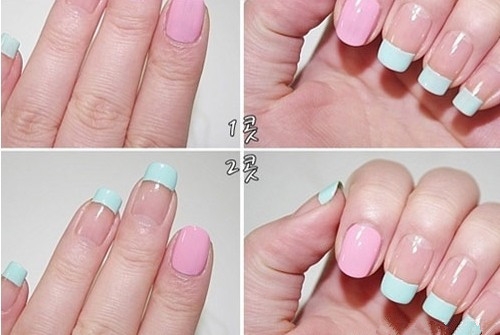 第一步:食指涂上粉色的指甲油,其他四个手指的尖端涂上薄荷绿的指甲油。