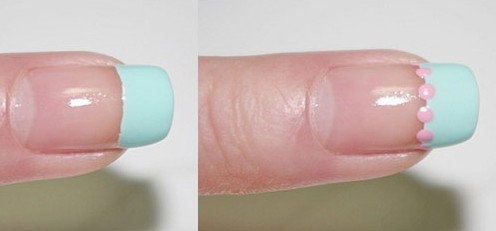 第二步:用牙签蘸上粉色的指甲油,在薄荷绿指甲油的边沿,均匀点上四个小点。