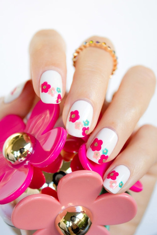 春季百花齐放,新鲜花朵给人带来快乐活力。这里给大家分享一款2014春季美甲图片教程,让新鲜浪漫的花朵为您的指甲增色!