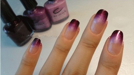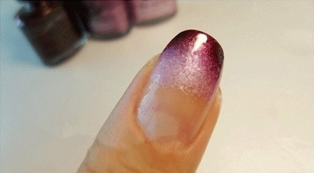第三步:注意深紫色的指甲油在外面,浅色的在指甲油内,这样才有渐变的效果。