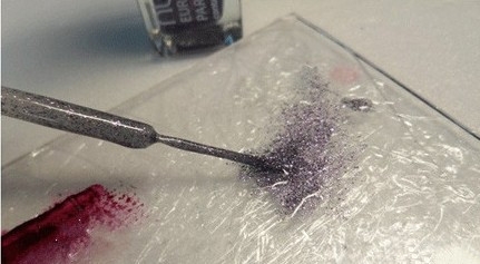 第四步:用紫色闪粉的指甲油,用细细的刷子蘸取。