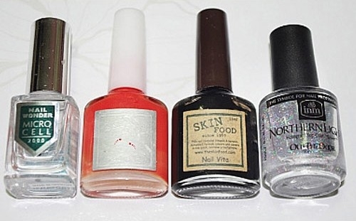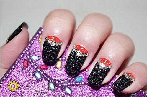 准备材料:打底指甲油、黑色指甲油、红色指甲油、闪粉指甲油