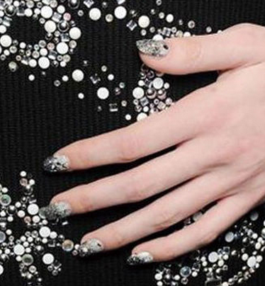 奢华bling bling风很适合参加派对,珍珠白色的珠光底油上,银色亮片大大小小的贴在指甲的前端,慢慢渐变到指尖的中部,潮感十足。