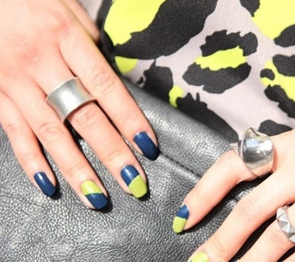 搭配要点:墨蓝色指甲油+荧光绿指甲油,用斜角的画法,打造拼接的效果。