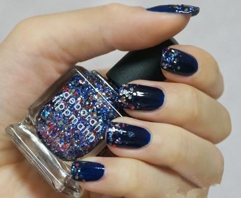搭配要点:宝蓝色指甲油+七彩亮片,涂上宝蓝色的指甲油,指尖涂上亮片指甲油。