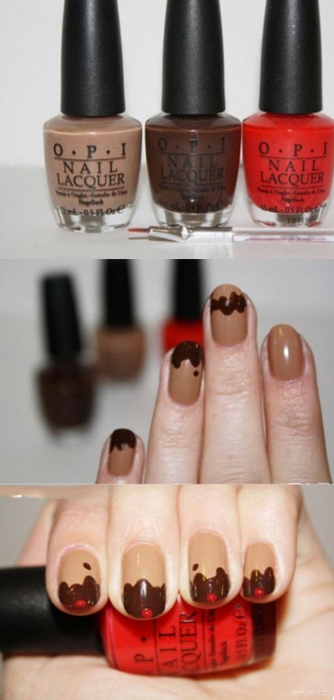 第二步:在指甲上点上一个小点,做出滴落的巧克力的图案(这样效果会更加的逼真),然后用红色的指甲油在指甲尖端上点上一个小红点,这一看就像樱桃。这款巧克力冰淇淋彩绘美甲就完成了。