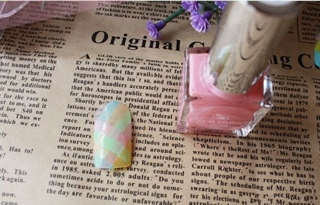 第六步:在涂上橘色、薄荷绿、粉色的指甲油,制造菱形的效果。