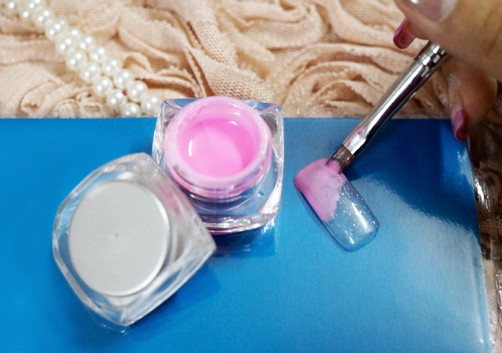 步骤二:用樱花粉色涂一半甲面,边缘不需要很整齐,因为这只是一个打底的颜色,照灯2~3分钟,如果颜色不够深的话可以多上一次颜色,记得要完全干透才进行下一步哦。