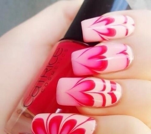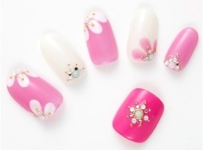 搭配要点:玫粉色指甲油+白色指甲油,上面花瓣图案和水钻的装饰更显精致。